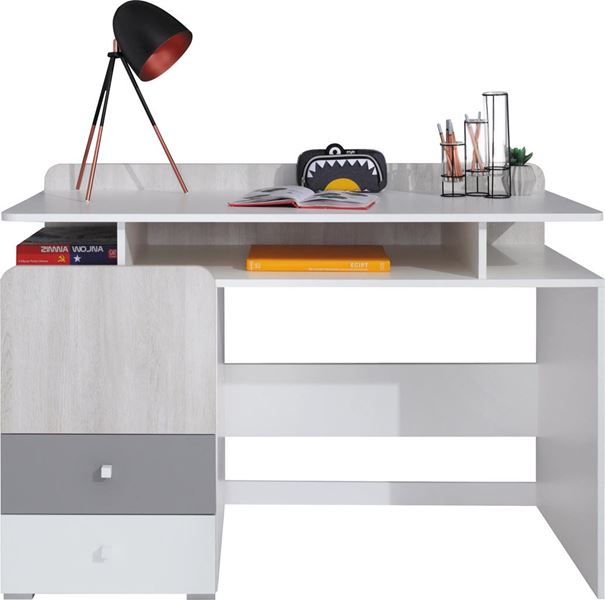 Elegantní a originální PSACÍ STŮL S nábytkem COMO zařídíte dětský a obývací pokoj nebo domácí pracovnu či předsíň. Nábytek v barevných kombinací bílá lux + dub WILTON+ šedá, MATERIÁL : LAMINO 16 MM