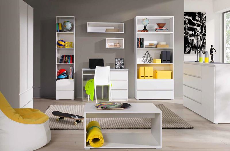 Nábytek kolekce Cosmo skvěle kombinuje design a praktičnost. Hodí se do ložnice, kanceláře, obývacího pokoje, předsíně či ložnice. Praktický regál Cosmo dá se vyrábět ze tří barev