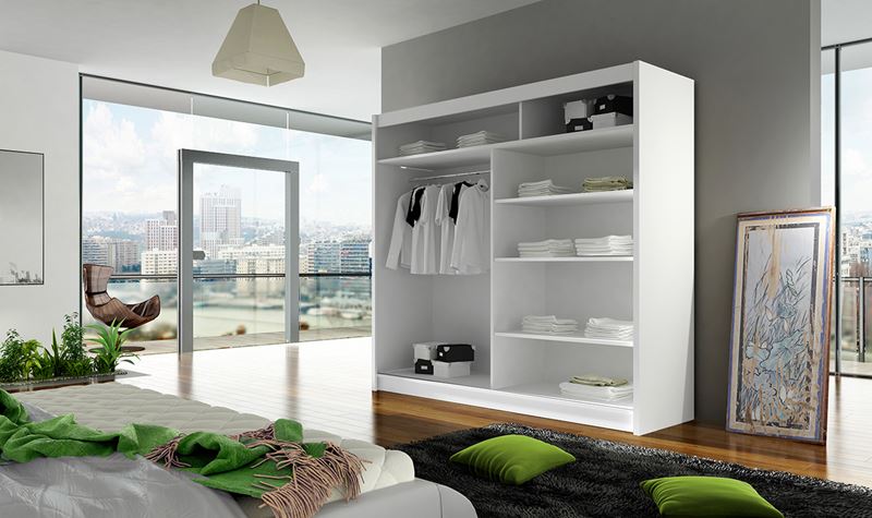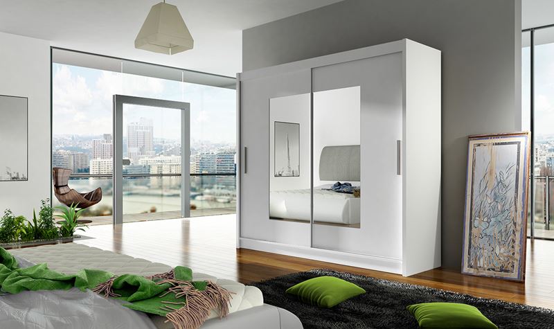 Skříň s posuvnými dveřmi, je vyrobena z kvalitního lamina o síle 16 mm a hrany jsou ukončeny ABS lištou. Vodící lišty jsou vyrobeny z odolného hliníku a splňují požadavky pro každodenní užívání. Skříň je doplněna zrcadlem, které jí dodává elegantní vzhled a místnost opticky zvětší a prosvětlí. Díky svým rozměrům a uspořádání poskytuje dostatek úložného prostoru. Skříň je dodávána v demontu.