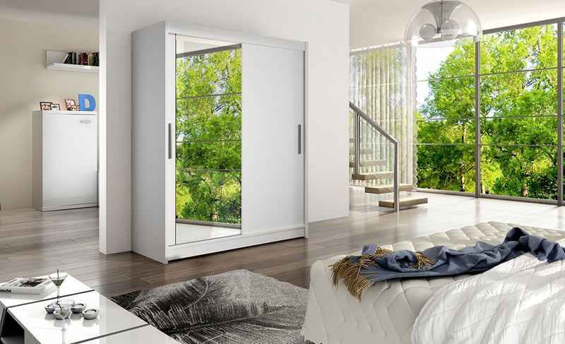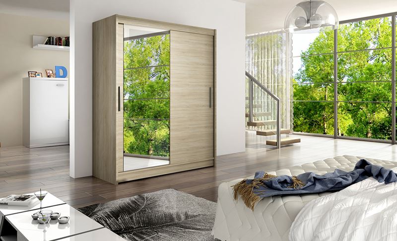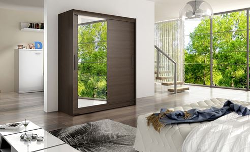Prostorná šatní skříň je vyrobena v moderním designu a nabízí velké množství praktického úložného prostoru (viz obrázek). Neocenitelný je systém trendových posuvných dveří (hliníkový pojezd), které usnadňují manipulaci a šetří prostor v interiéru. Korpus a dveře jsou vyrobeny z kvalitního lamina (16 mm). Skříň je dodávána v demontu a v různém barevném provedení.
